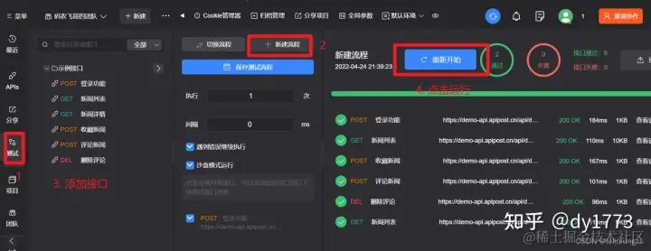 我们只需要点击测试按钮,新建流程,选择需要批量测试的接口,点击开始测试即可轻松完成多个接口的集成测试。