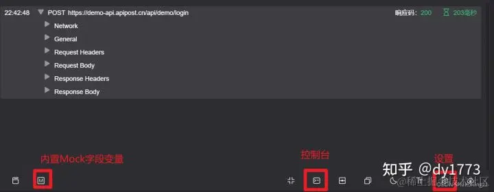 (6)基础操作区:这个区域最常用的就是内置Mock字段变量以及控制台功能,当然也可以进行一些设置操作。我们可以在设置窗口中设置代理,添加CA证书,进行发送设置等操作。