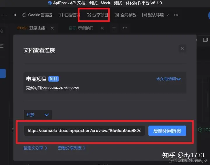 如果我们想生成整个项目的全部接口文档,那也很简单,只需要点击分享项目按钮即可。