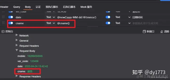 这里我选择了一个日期的Mock变量,再次点击发送请求,点击控制台按钮,找到那个请求,查看Request Body即可看到设置的随机date参数。
