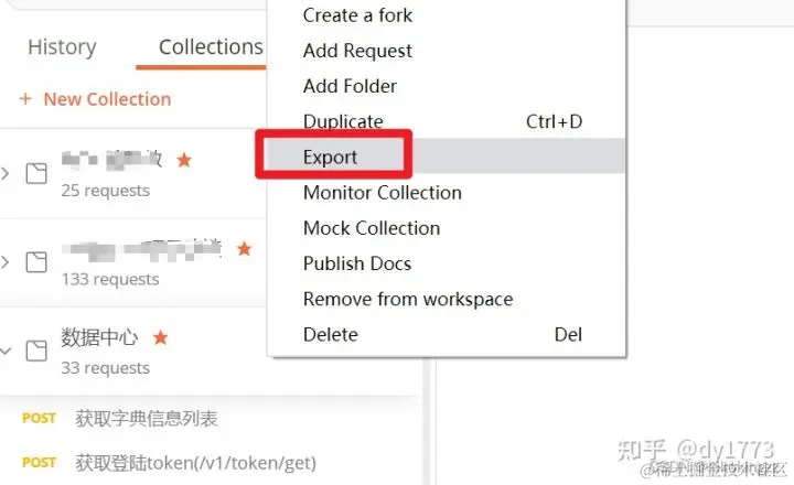 1.在postman上选中项目,右键,选中 Export 按钮导出项目。