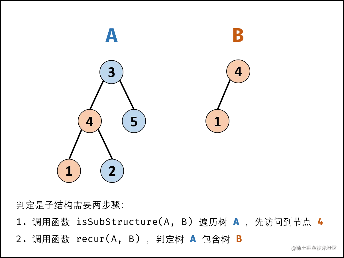 解题思路: 若树B是树A的子结构,则子结构的根节点可能为树A的任意一个节点。 因此,判断树B是否是树A的子结构,需完成以下两步工作: