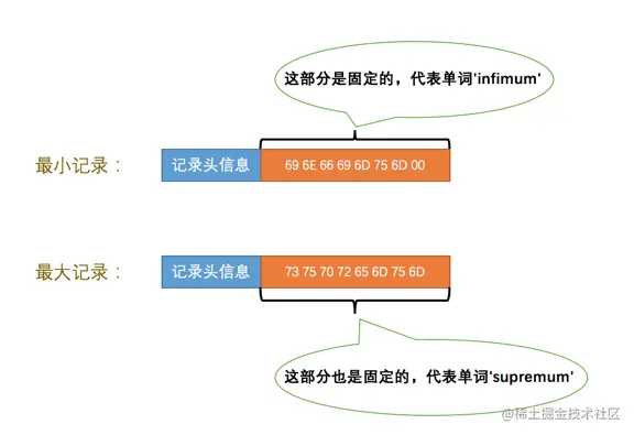 Infimum + Supremum | 最小记录和最大记录 | 26字节 | 两个虚拟的行记录 |