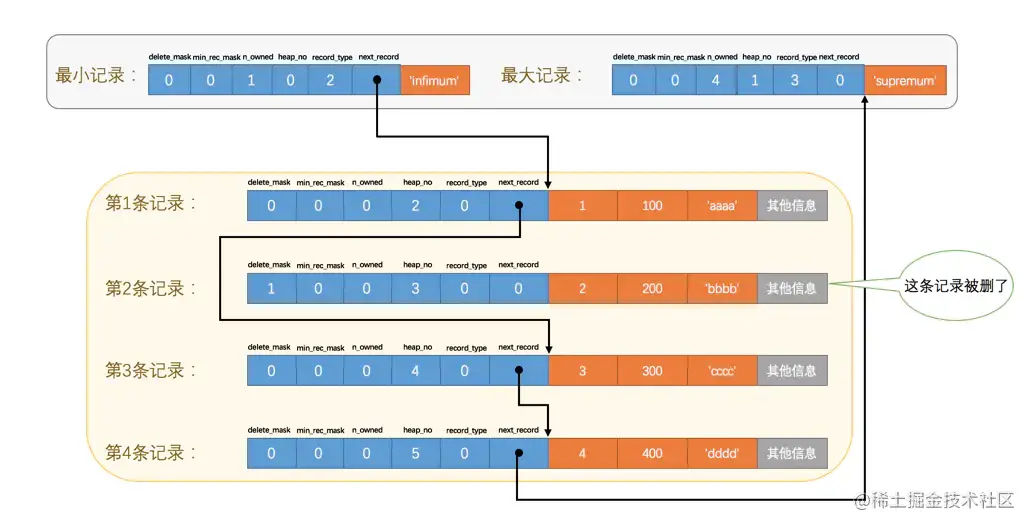 其中 delete_mask 的作用是用来标志一条记录是否已经被删除了,当删除一条记录的时候,会将页中对应记录的该标志为置为1,然后调整链表的指向,跳过本条记录。