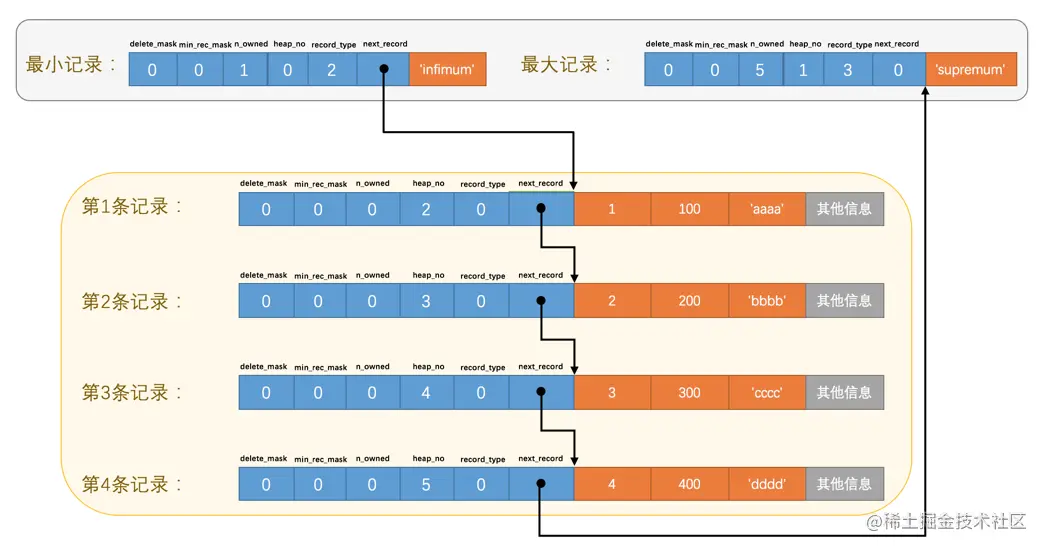 | record_type | 3 | 表示当前记录的类型,0表示普通记录,1表示B+树非叶子节点记录,2表示最小记录,3表示最大记录 |