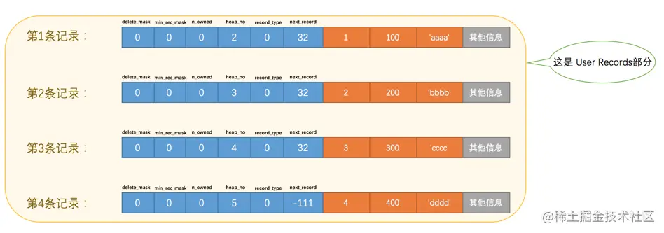 delete_mask:这个属性标记着当前记录是否被删除,占用1个二进制位,值为0时记录并没有被删除,为1时记录被删除heap_no:这个属性表示当前记录在本页中的位置next_record:从当前记录的真实数据到下一条记录的真实数据的地址偏移量