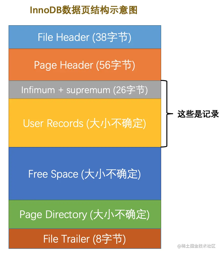 File Header | 文件头部 | 38字节 | 页的一些通用信息 |
