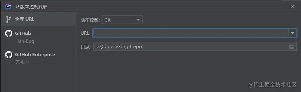 点击“克隆”后即可在选定代码存放根目录后通过输入仓库的URL进行克隆操作。若克隆的是github中的代码且其位于github的个人仓库内,也可以在goland中登录github后直接拉取个人仓库内的代码。