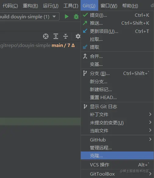 在goland中Git工具是集成在VCS(版本控制)工具中,若未曾在goland中使用过git,那么下图中顶部的Git工具位将被VCS代替。而在VCS中设定版本控制工具为Git后,工具栏里的VCS即会被替换为Git。选中其中的“克隆”即为代码仓库克隆的第一步。
