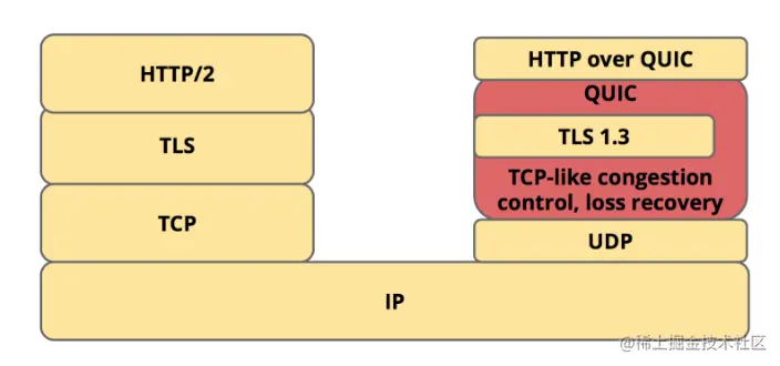 - 减少了TCP三次握手及TLS握手时间: 不管是HTTP1.0/1.1还是 HTTPS,HTTP2.0,都使用了TCP进行传输。HTTPS和HTTP2还需要使用TLS协议来进行安全传输。这就出现了两个握手延迟,而基于UDP协议的QUIC,因为UDP 本身没有连接的概念,连接建立时只需要一次交互,半个握手的时间