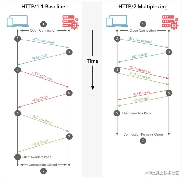 - 服务端推送(Server Push): 采用了SPDY的网页,例如我的网页有一个sytle.css的请求,在客户端收到sytle.css数据的同时,服务端会将index.js的文件推送给客户端,当客户端再次尝试获取index.js时就可以直接从缓存中获取到,不用再发请求了。