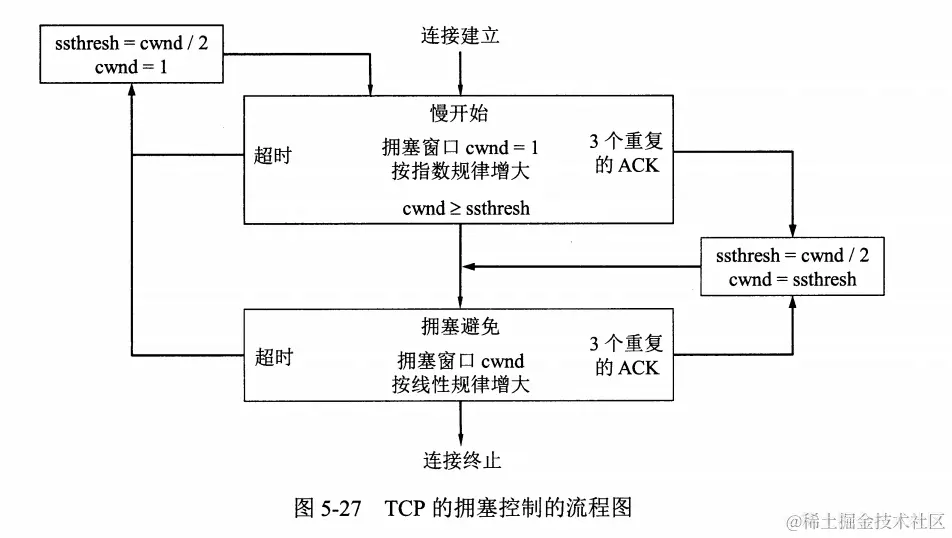 - 当cwnd = ssthresh时,既可以使用慢开始算法,也可以使用拥塞避免算法