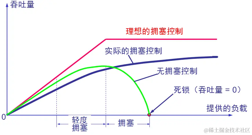 又上图可以看到,如果出现了拥塞,如果不加处理,就有可能出现死锁等问题,导致吞吐量为0,极大的损害了整个网络的传输能力