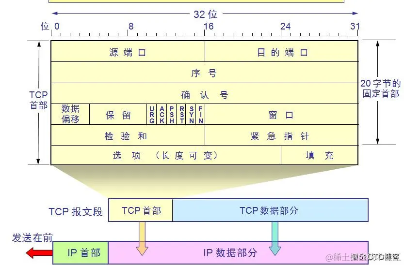 - 数据偏移:占4位,指出TCP报文段的数据起始处离TCP报文段的起始处有多远,也就是指示TCP报文段的首部长度,由于只有4位,所以单位是4字节,4位二进制最大表示15,所以TCP首部最长为4*15=60字节,而固定首部为20字节,所以选项最大为40字节