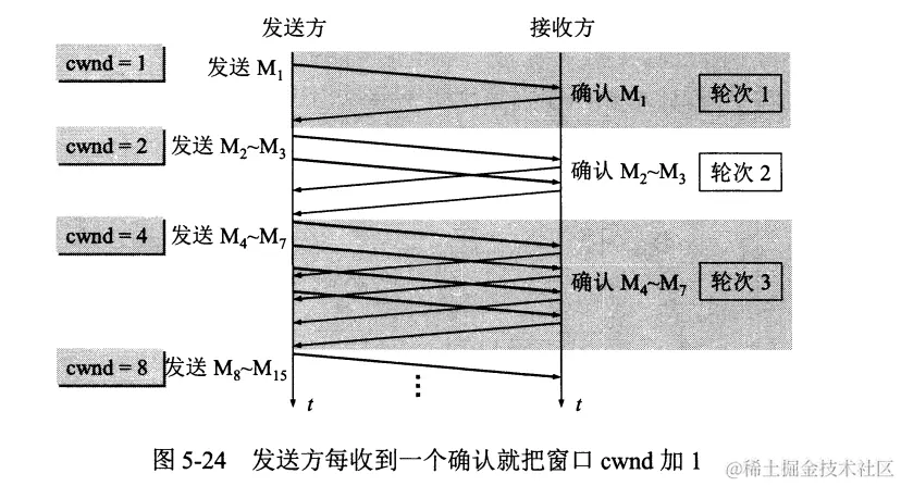 - 当cwnd < ssthresh时,使用上述的慢开始算法