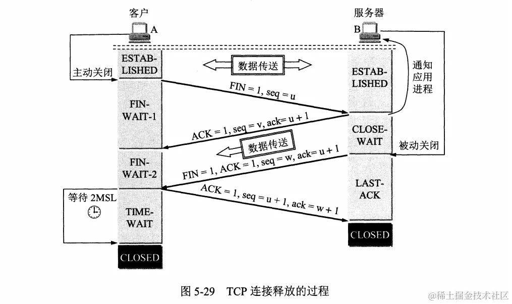 - A在收到B的释放报文之后,必须发出确认,确认报文中ACK = 1,ack = w+,seq = u+1,然后进入TIME - WAIT(时间等待)状态,这个时候TCP连接还没有释放掉,需要经过时间等待器设置的时间2MSL后,A才会进入CLOSED状态