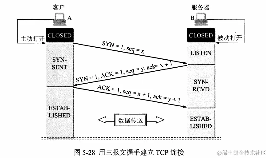 - A向B发送请求报文段,该报文段SYN = 1,同时选择一个初始序号seq = x,TCP规定,SYN报文段(即SYN=1的报文段)不能携带数据,但是要消耗掉一个序号
