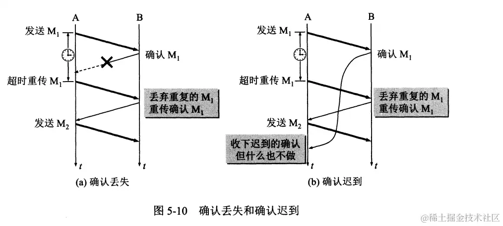 - 确认丢失:接收方发送的确认消息丢失了