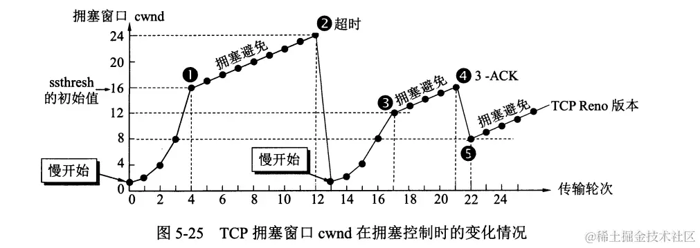 (上图是以报文段为单位的,真正的拥塞窗口是以字节为单位的,只是为了方便理解)