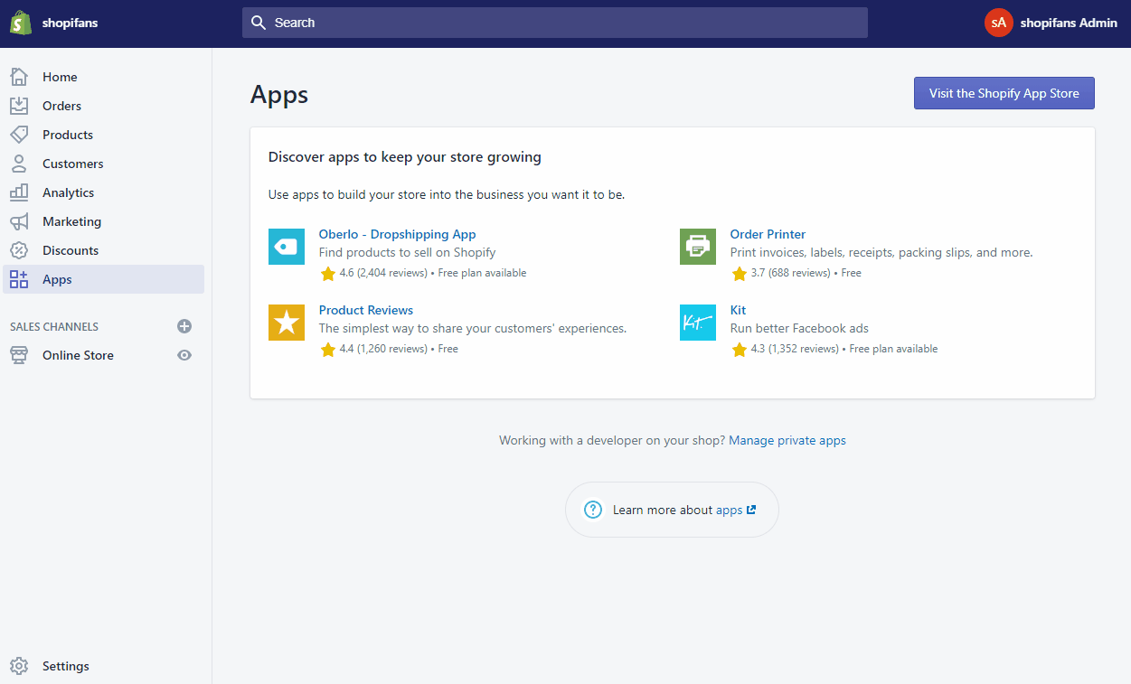 请登录Shopify后台,然后创建一个私人应用程序。