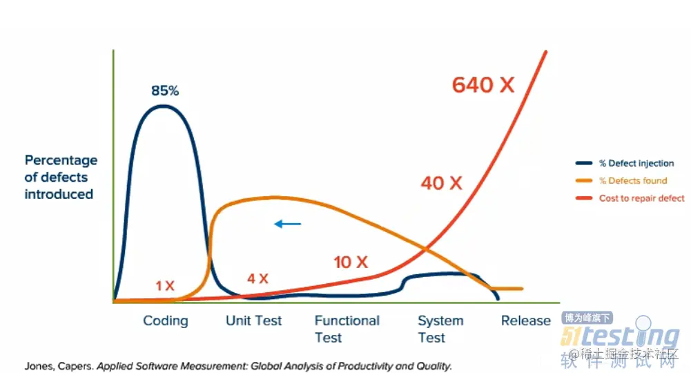 对于需求,代码,质量,效率,《代码大全》很早就从软件工程实践角度说明了一个bug产生的不同阶段,修复一个bug的成本从需求阶段,设计阶段,测试阶段有着天壤差别。不仅从成本上,从修复难度,引入新问题的可能性,沟通成本,团队状态也会有很大的影响。由于大部分bug都是在写代码的阶段就引入的,测试左移本质上可以尽早的发现,预防问题,使用必要的测试手段在软件开发周期的早些阶段发现问题。测试越是集中到后期,尤其是集成测试时进行功能测试,产品的复杂度就越高,出现问题后,越难以定位bug,修复时间花费越长。所以,bug越早被发现,越节约成本。这也是测试左移被普遍接受的原因。
