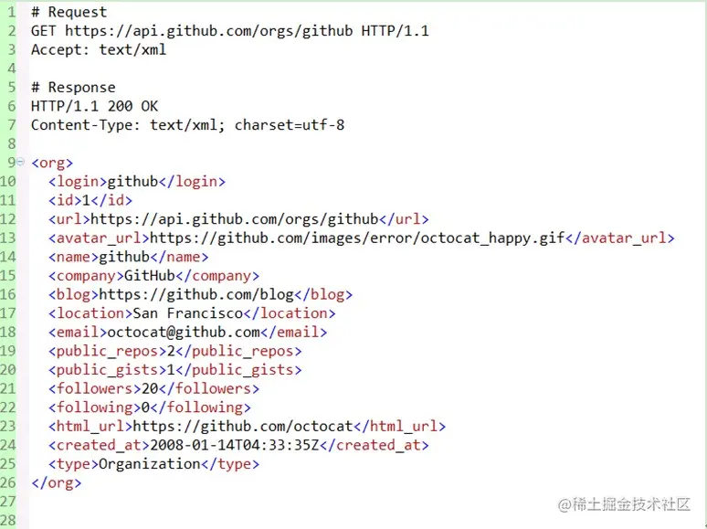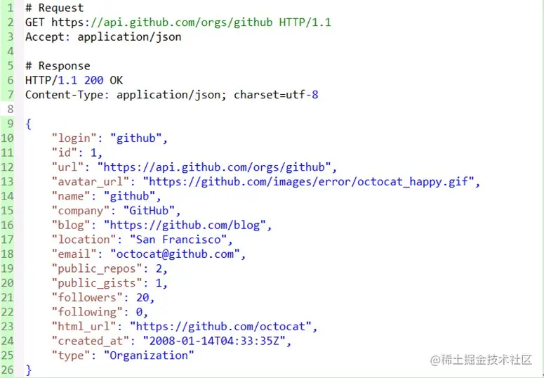看一个github为例子,请求某组织资源的json格式的表述形式: