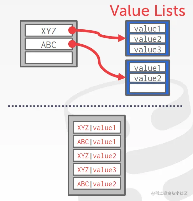对于哪些同一个健,不同数据的存储方式,我们有以下两种解决方案。