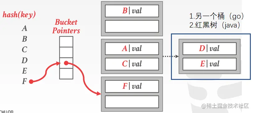 使用最多的是链式哈希表, DBMS为哈希表中的每个槽维护一个桶的链表。散列到同一插槽的键只需插入该插槽的链接列表中