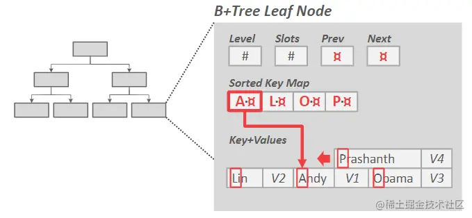 - 键映射/间接寻址:几乎每个人都使用的方法是用单独字典中的键值对索引替换键。这可以显著节省空间,并可能为点查询提供快捷方式(因为索引指向的键值对与叶节点指向的键值对完全相同)。由于字典索引值的大小很小,因此有足够的空间将每个键的前缀放在索引旁边,这可能允许一些索引搜索和叶扫描甚至不必追踪指针(如果前缀与搜索键完全不同)。