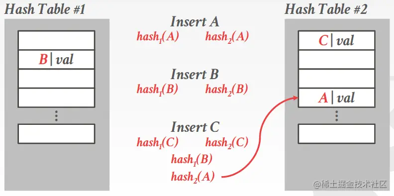 具体的过程比较复杂,每个条目记录了它们与最佳位置的“距离”。然后,在每次插入时,如果要插入的键在当前插槽中距离其最佳位置的距离大于当前条目的距离,我们将替换当前条目,并继续尝试将旧条目插入表中更远的位置。