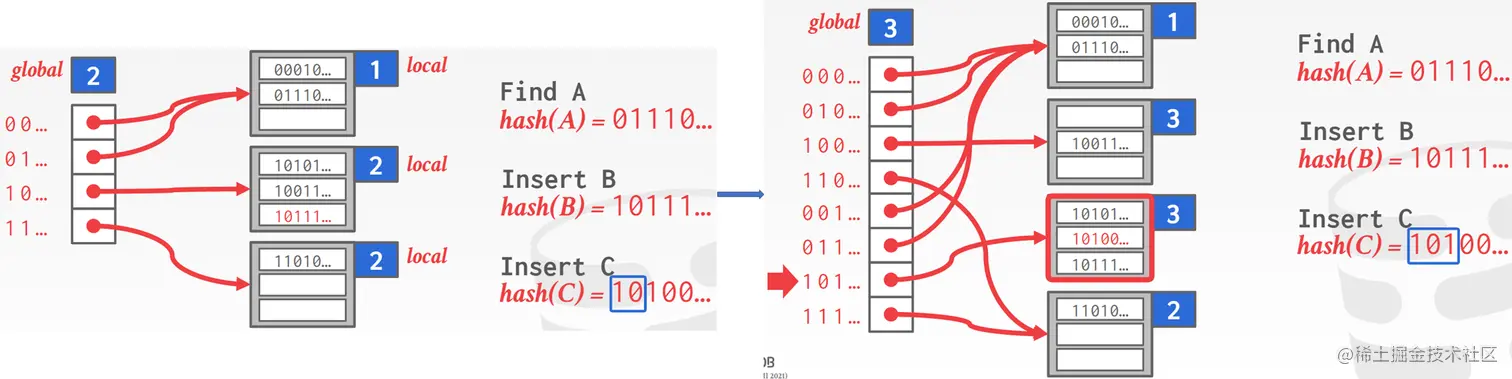 下图中插入C时发生溢出,此时global加一,所有元素进行rehash。在java和go的哈希map实现中都用到了这种思想,当链式哈希表无法解决问题时,java和go就会以这种思想来增加桶的数量。让单一桶内的元素减少。