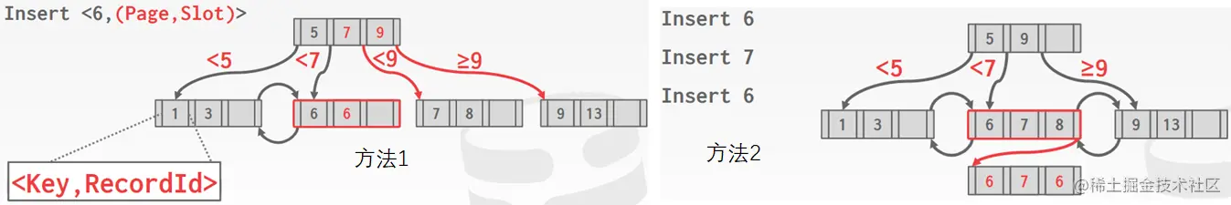 在B+树中复制关键点有两种方法。第一种方法是在密钥中附加记录ID。由于每个元组的记录ID都是唯一的,这将确保所有键都是可识别的。第二种方法是允许叶节点溢出到包含重复密钥的溢出节点中。虽然没有存储冗余信息,但这种方法的维护和修改更加复杂。
