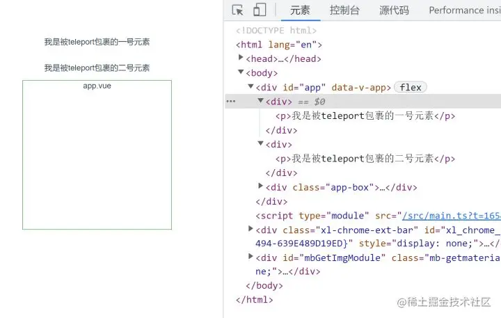 可以看到两个元素按照顺序渲染到了 id 为 app 的元素下面。如果交换 teleport 的顺序,渲染出来的顺序也会被交换。