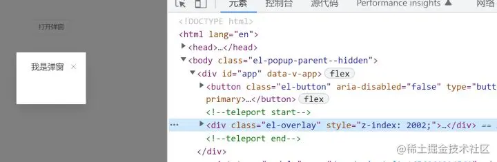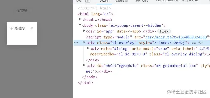 我们可以看到虽然弹窗组件是写在 App.vue 组件里面的,但是渲染出来的结果却是弹窗组件属于 body 节点,这是因为我们利用了 Element-plus 中弹窗的 append-to-body 属性,我们把该属性去掉再看看什么结果:
