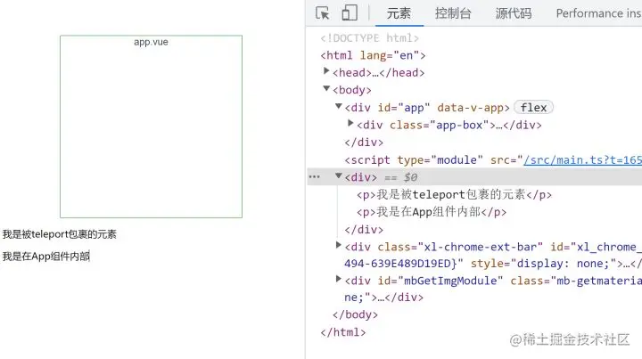 可以看到输出结果是一样的,说明被 teleport 包括的元素与 app.vue 组件之间的逻辑关系没有发生改变。