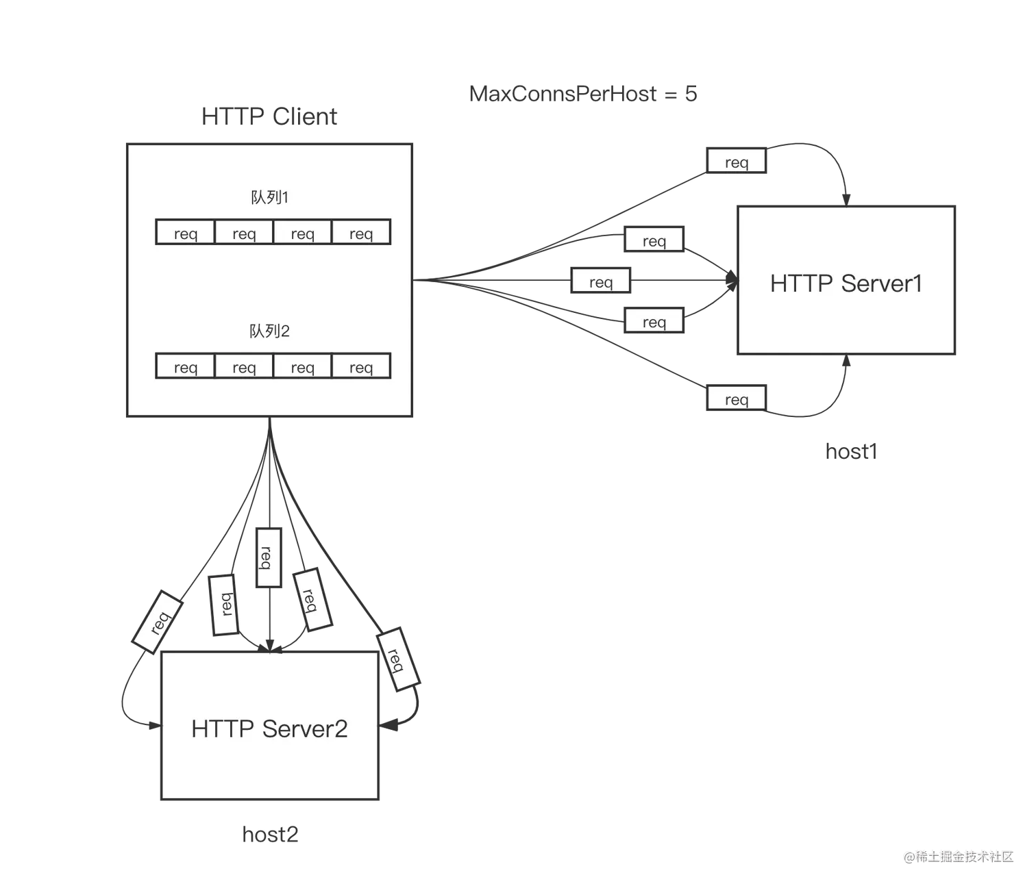 不过在这份DefaultTransport的“配置”中,并没有有关向某个host建立最大连接数的设置,因为在Transport结构体中,起到这个作用的字段是MaxConnsPerHost: