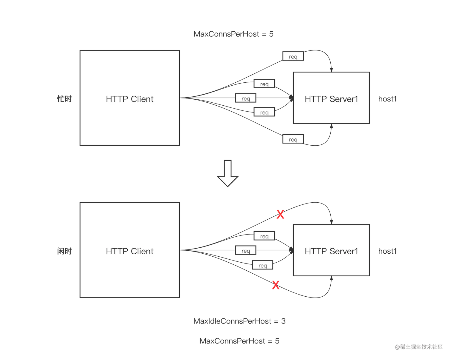 Transport结构体还有一个字段与idle池有关,那就是MaxIdleConns,不同于MaxIdleConnsPerHost只针对某个host,MaxIdleConns是针对整个Client的所有idle池中的连接数的和,这个和不能超过MaxIdleConns。