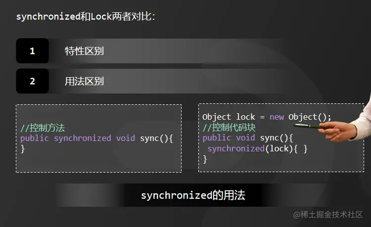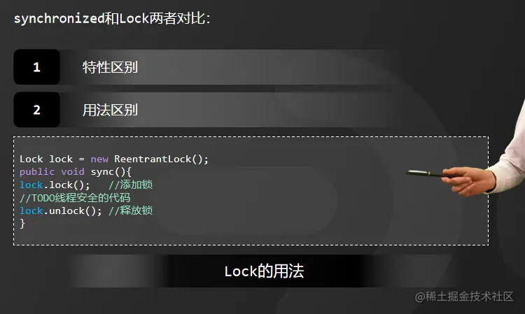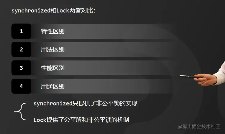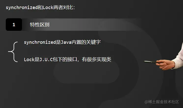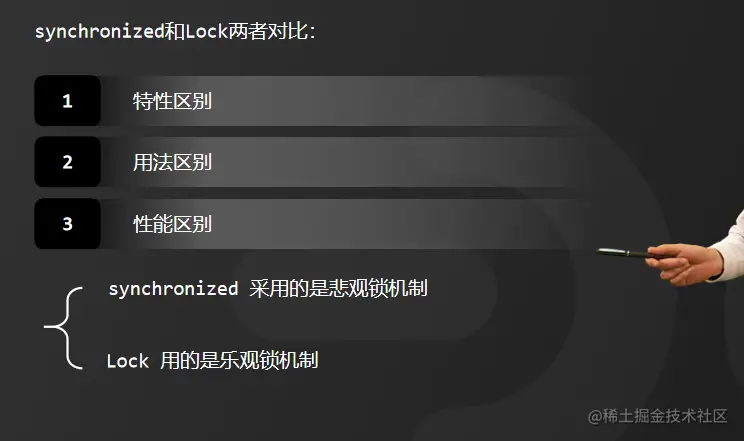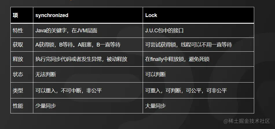 而synchronized是关键字,无法去扩展实现非阻塞竞争锁的方法。另外,synchronized只有代码块执行结束或者代码出现异常的时候才会释放锁,因此,它对锁的释放是被动的。