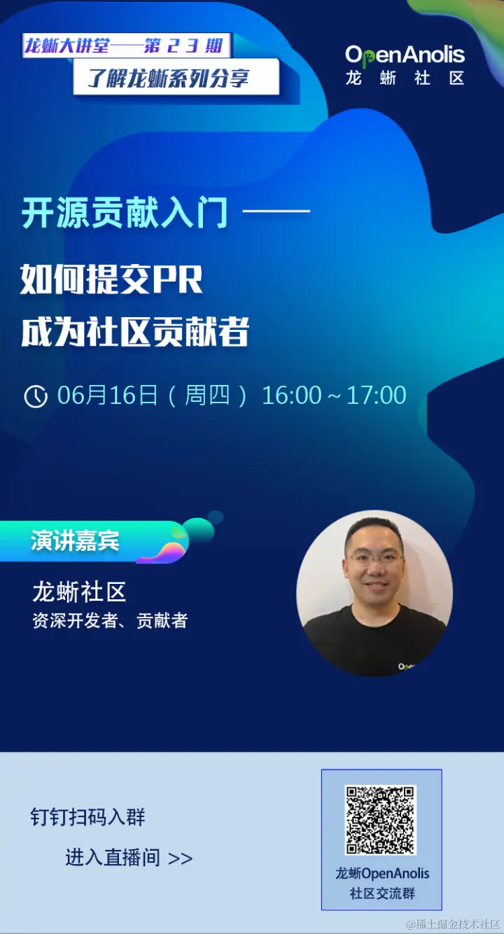 「龙蜥大讲堂」第 23 期直播来啦!本期龙蜥大讲堂直播邀请了龙蜥社区资深开发者、贡献者来分享《 开源贡献入门-如何提交 PR 成为社区贡献者?》,快来扫码入群,预定前排小板凳观看直播吧!
