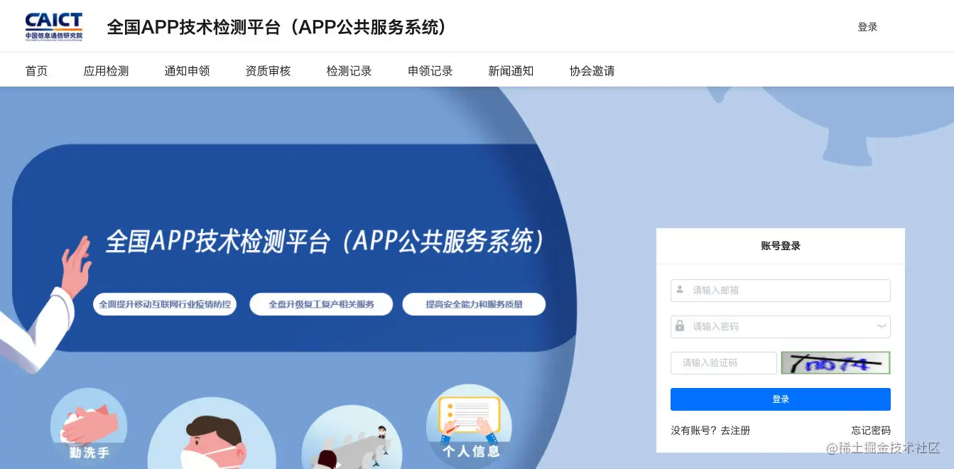 终于,我们知道,具体的信息除了应用商店提供给我们的邮件内容外,可以在全国APP技术检测平台(APP公共服务系统) 网站查到。于是赶紧到网站注册了用户。