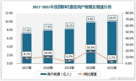近年来,即时通讯是已经深入到我们的工作、学习和工作中,而新冠疫情的爆发更是激发了移动化沟通交流用户的在线需求。《中国即时通信市场现状深度分析与发展前景预测报告(2022-2029年)》显示:2021年我国即时通讯用户为10.07亿人,同步增长率2.7%,企业级即时通讯在疫情的影响下,需求暴涨。在此背景下,IM厂商迎来新机遇和挑战,除了要满足用户更严格的交互体验需求和业务场景外,还需要将通信能力与应用场景深度融合,为企业客户提供统一集成式的数字化解决方案。