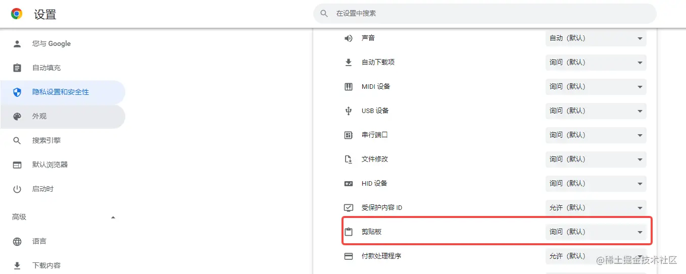(2)read表示是否允许读取剪切板的内容,默认值是false, 也就是默认不实时读取剪切板的内容。我们通过例子的截图知道默认clipboard-read的值是prompt即询问,您可以通过浏览器的隐私设置来设置对于剪切板的权限: