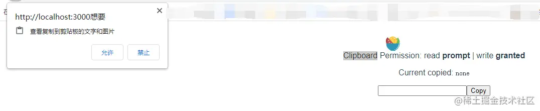 usePermission用于获取权限,使用其查看了clipboard-read和clipboard-write的权限,并将权限展示到页面上。通过下图可以看到读取的权限是prompt也就是询问,而写入操作被授权了即granted。