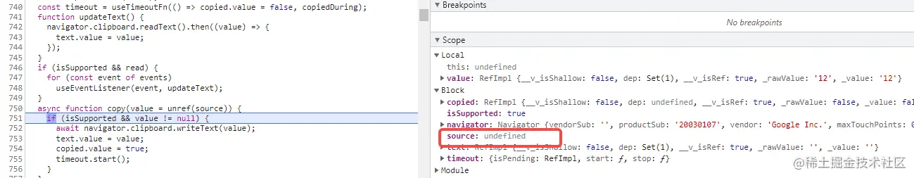 可以看到value对应传给copy的参数input, 而source是undefined。