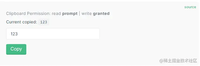 更多关于Clipboard API的细节以及兼容性问题您可以访问MDN文档详细学习。看一段示例代码:
