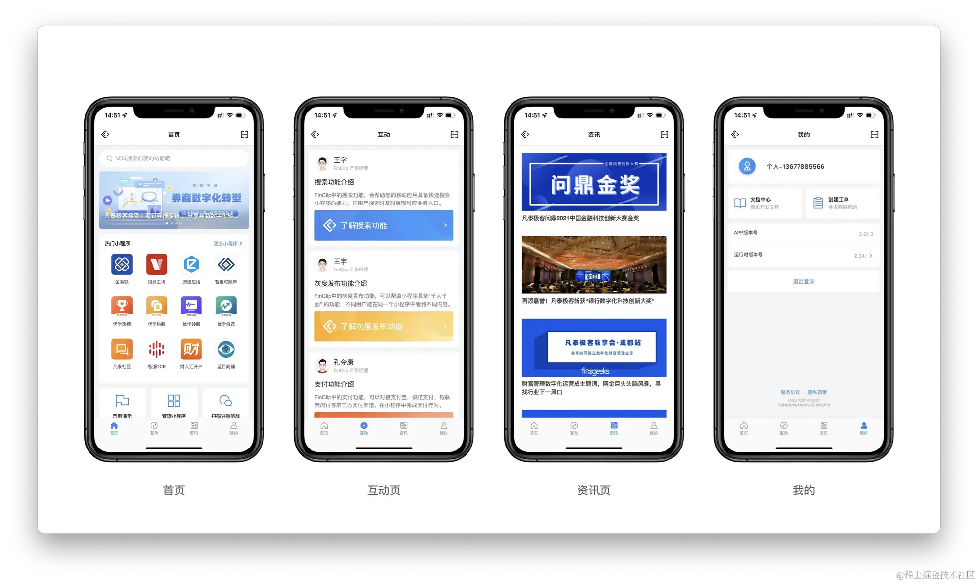当我们在应用商店中获取并下载「FinClip APP」到自己的手机后,会在登录后看到如上图所示的 4 个页面,分别为「首页」,「互动页」,「资讯页」与「我的」。