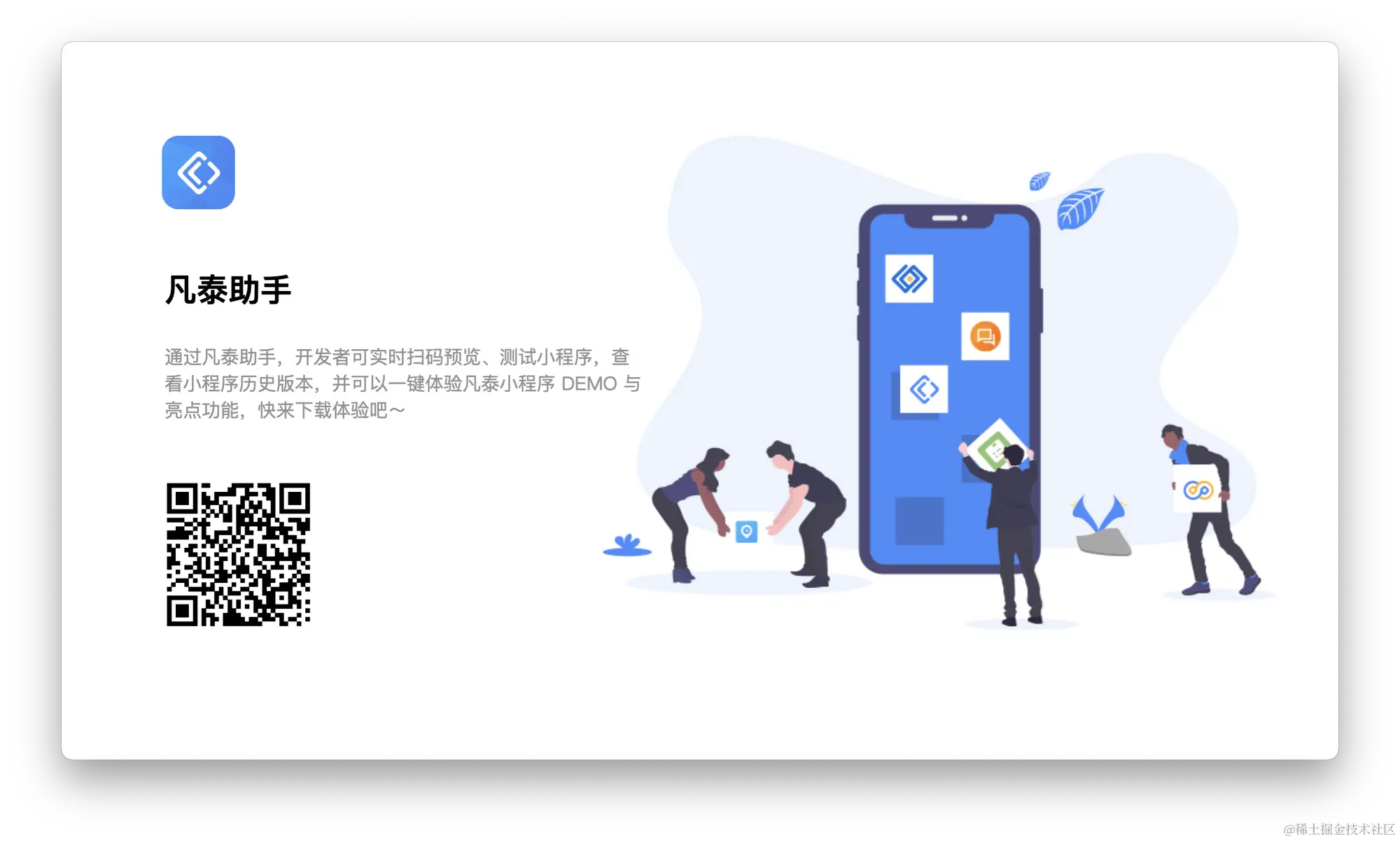 - iPhone 用户直接在 App Store 中搜索「FinClip」,结果中第一个「FinClip-凡泰助手」就是我们所需要的应用。扫描上图中的二维码跳转到应用商店也能够获取应用;