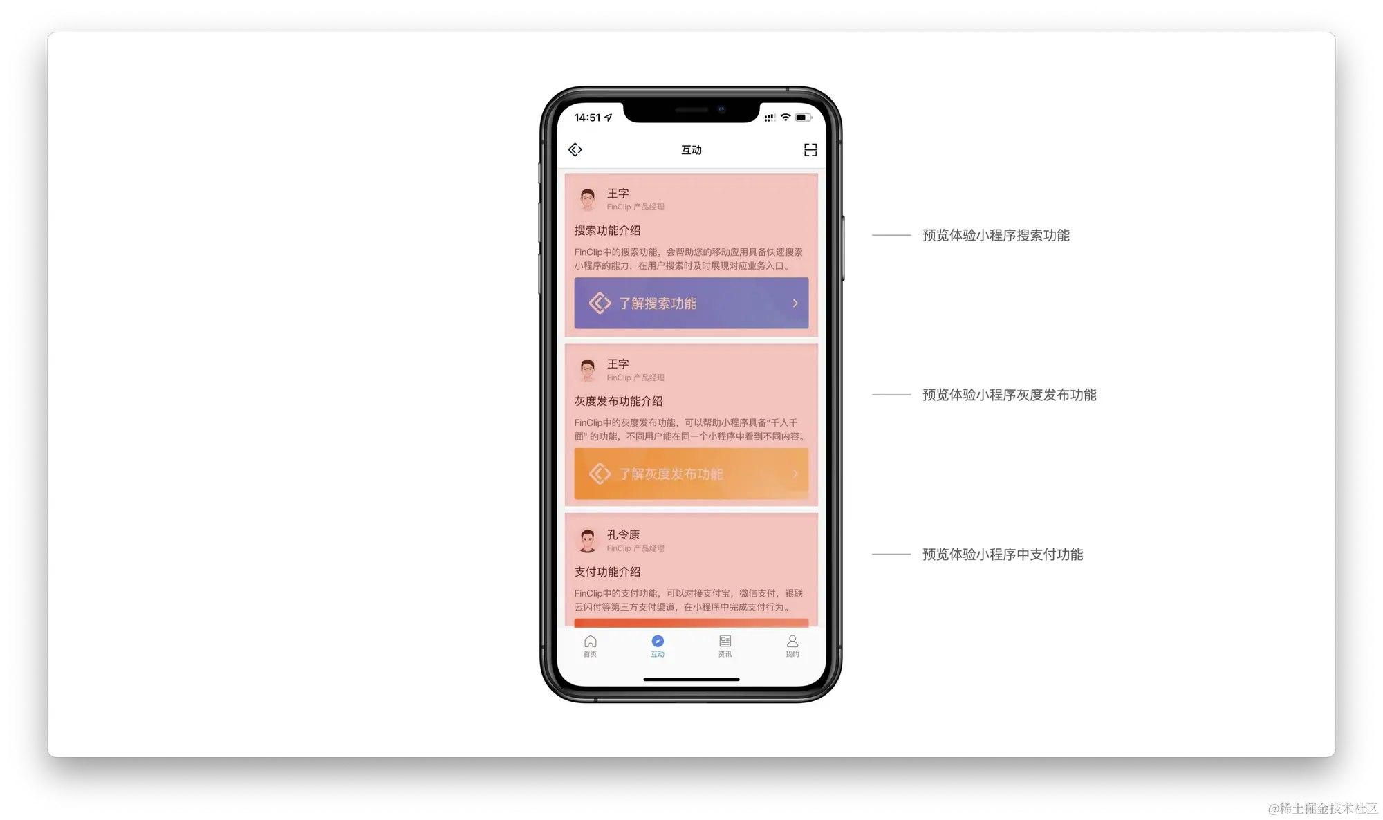 在「互动」页中,通过分别点击不同的卡片,将可以直接体验到「搜索能力/灰度发布/支付功能」等不同 FinClip 小程序中所特有的功能,帮您更进一步的了解 FinClip 小程序的相关特性与能力。