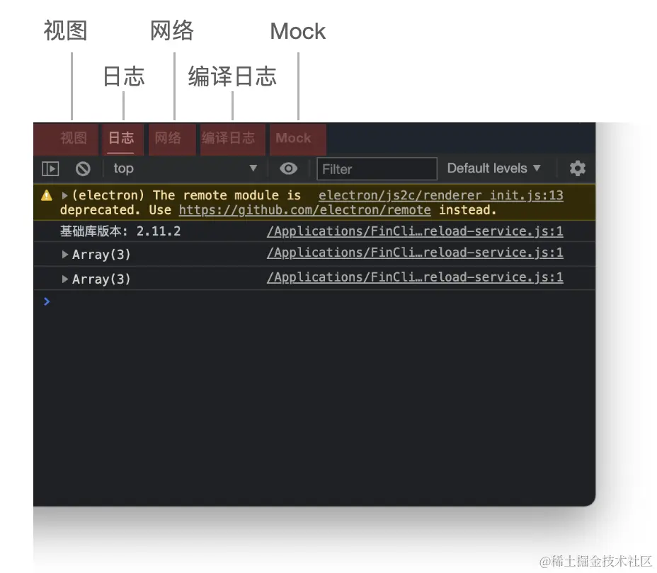- 「日志」视图是调试面板默认的视图,主要用于输出信息,我们在 JS 代码中使用 console.log(message) 所输出的 messag 就会显示在这个视图中,开发者也可以在这里输入并执行 JS 代码;
