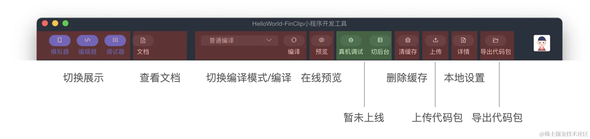 - 「真机调试」与「切后台」暂时还没有在 FIDE 中进行上线,前者的主要功能是让开发者在真机中调试小程序,所有的操作信息都会被传回 FIDE 中;后者则是模拟手机中的前后台切换操作(就像在 iPhone 中返回 HOME 页一样);